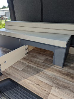 Lit peigne avec tiroir sur T6, isolation, moquette, batterie auxiliaire, coussins, vitre