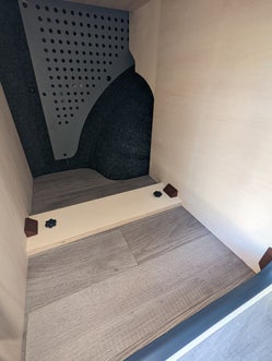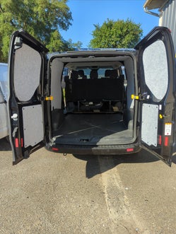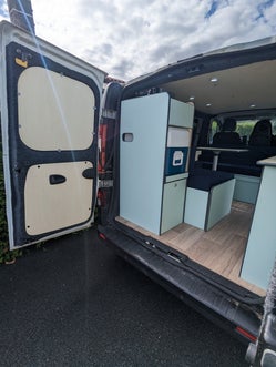 Conversion complète sur VOLKSWAGEN Transporter T6.1 isolation thermique et phonique, moquette, lino , batterie auxiliaire, panneau solaire, habillage peuplier, meubles sur mesure et coussins