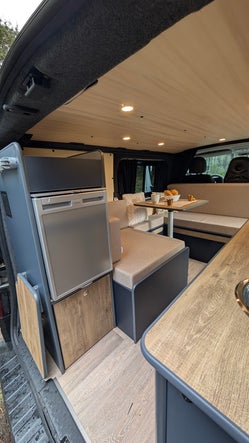 Conversion complète sur Vito L2 , isolation thermique et phonique, moquette, lino , batterie auxiliaire lithium panneau solaire habillage peuplier banquette en U et coussins meuble cuisine et meuble frigo chauffage homologation VASP